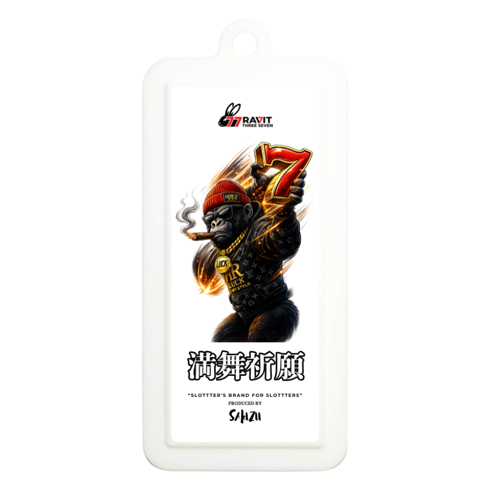 勝負運を呼び込む “満舞(まんまい)祈願” デザインとして、RAVIT THREE SEVEN の大人気キャラクター ゴージャスゴリラ がラバーキーホルダーになって登場!