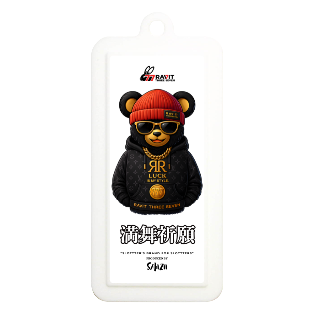 勝負運を呼び込む “満舞(まんまい)祈願” デザインとして、RAVIT THREE SEVEN の大人気キャラクター ゴージャスベア がラバーキーホルダーになって登場!