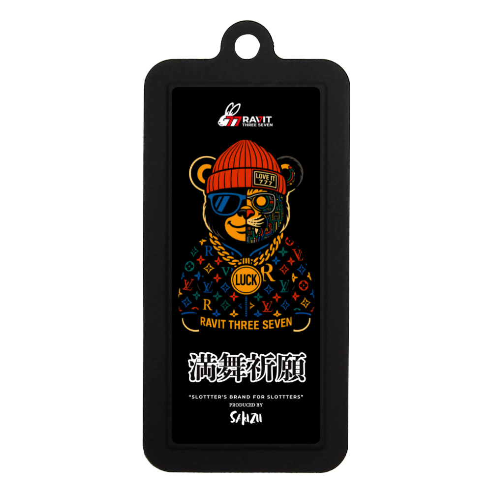 勝負運を呼び込む “満舞(まんまい)祈願” デザインとして、RAVIT THREE SEVEN の大人気キャラクター ゴージャスベア がラバーキーホルダーになって登場!